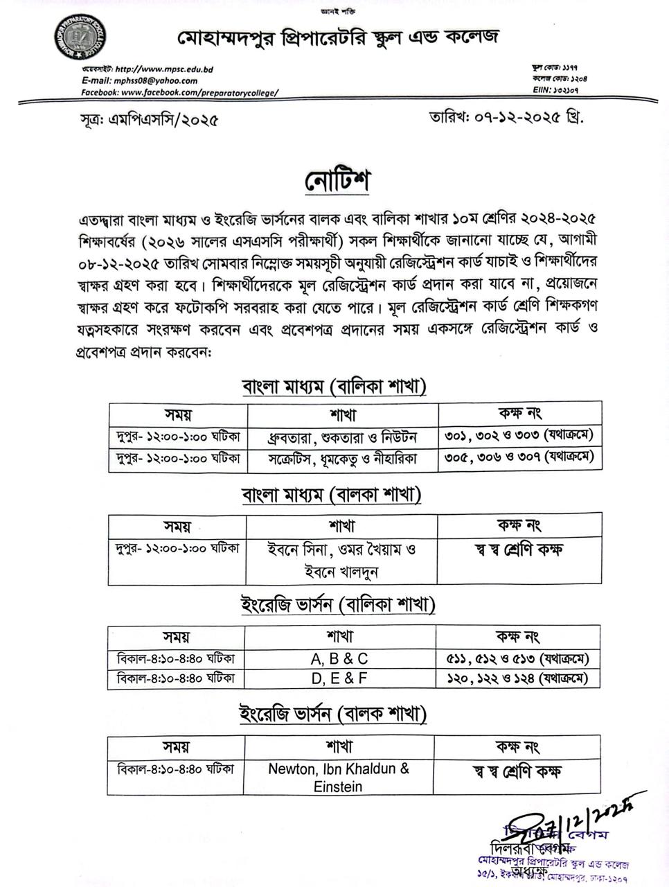দশম শ্রেণির (এসএসসি ২০২৬ ব্যাচ) শিক্ষার্থীদের রেজিস্ট্রেশন কার্ড যাচাই ও স্বাক্ষর গ্রহণের তারিখ ও তালিকা